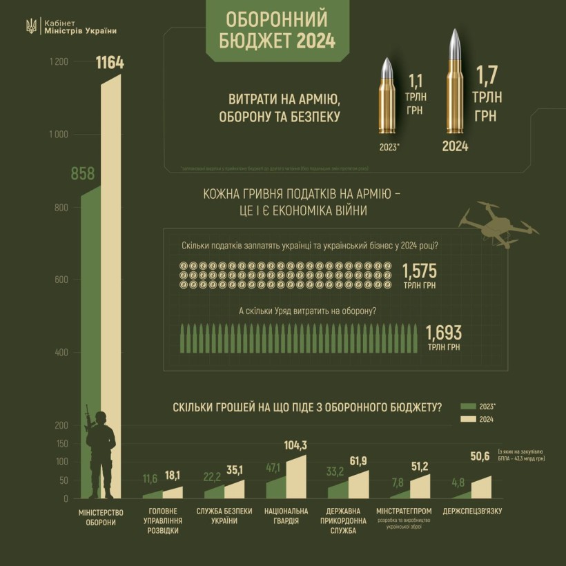 Усі 1,575 трлн грн податків, які заплатять в бюджет українці та український бізнес у 2024-му, спрямують на оборону. Окрім того, Уряд залучить на оборонні потреби кошти, отримані через розміщення військових облігацій, дивідендів від держкомпаній, прибутку НБУ, приватизації тощо. Інші видатки держави допоможуть профінансувати міжнародні партнери.
