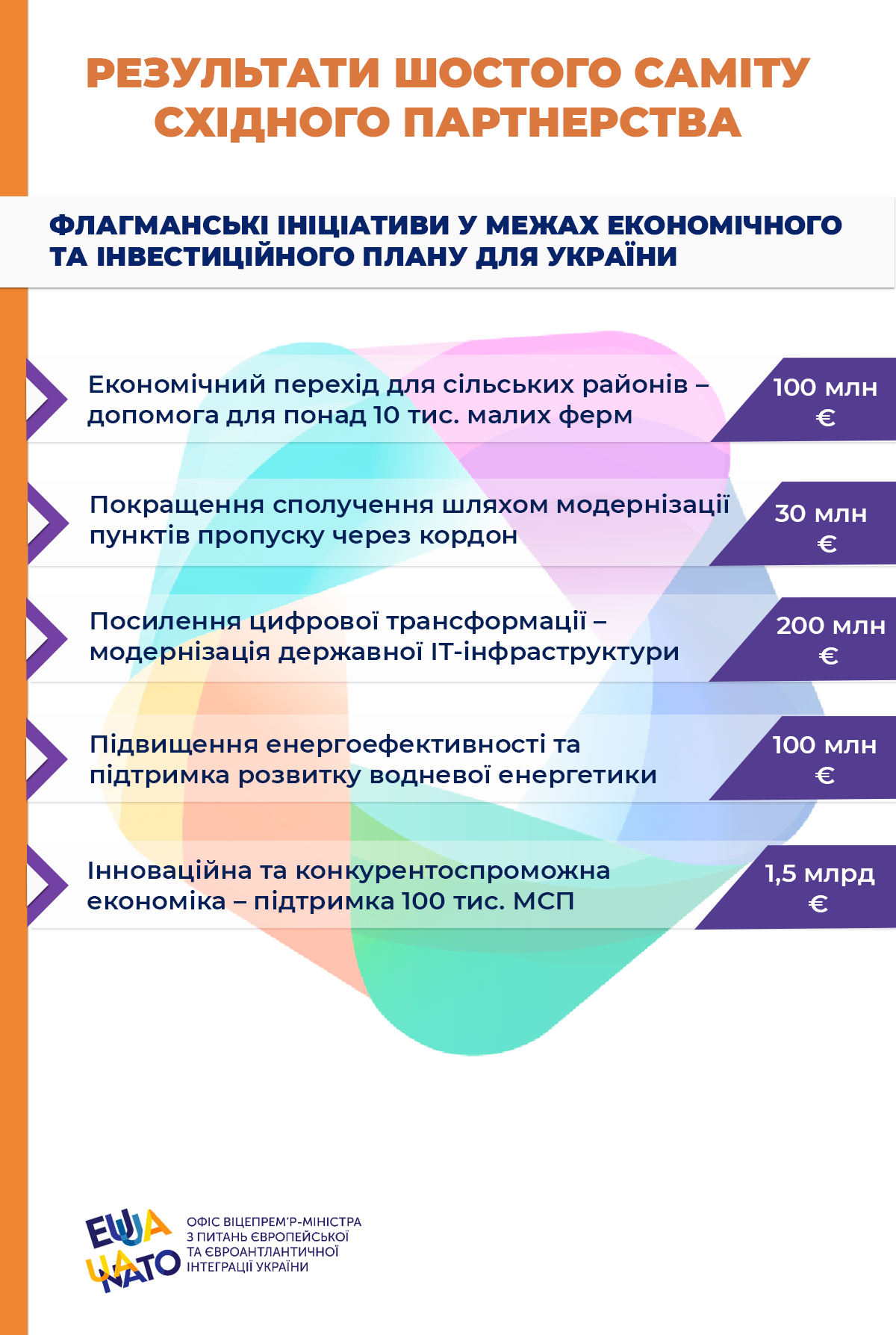 Сьогодні на Саміті Східного партнерства (СхП) було офіційно представлено Економічний та інвестиційний план для країн СхП. Він передбачає залучення 2,3 млрд євро як гранти, поєднання фінансових ресурсів та гарантій, що сумарно має потенціал залучити до 17 млрд євро державних і приватних інвестицій.