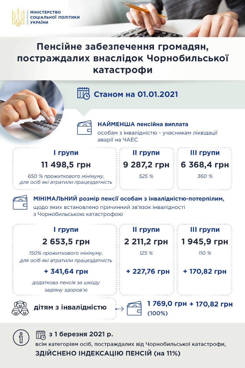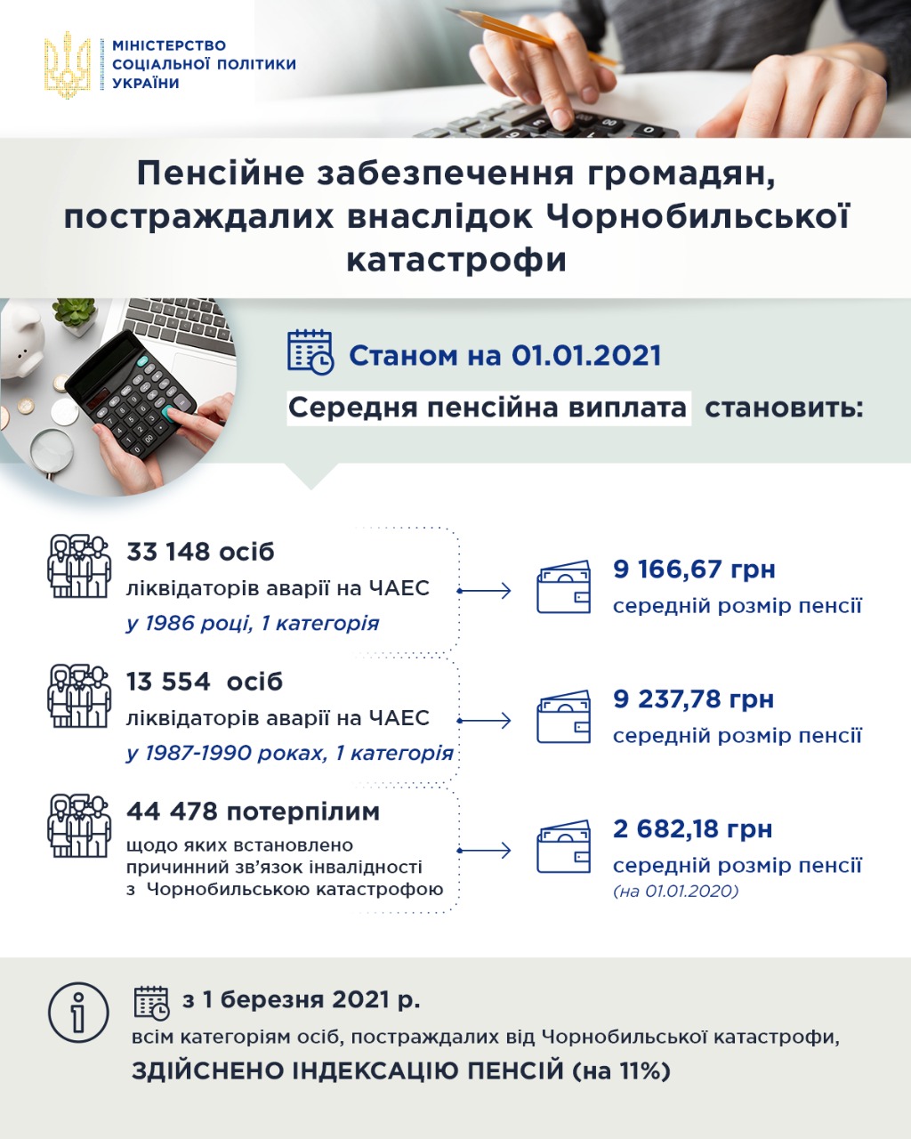 Нагадаємо, всім категоріям осіб, постраждалих внаслідок Чорнобильської катастрофи, здійснено індексацію пенсій на 11% у березні 2021 року.